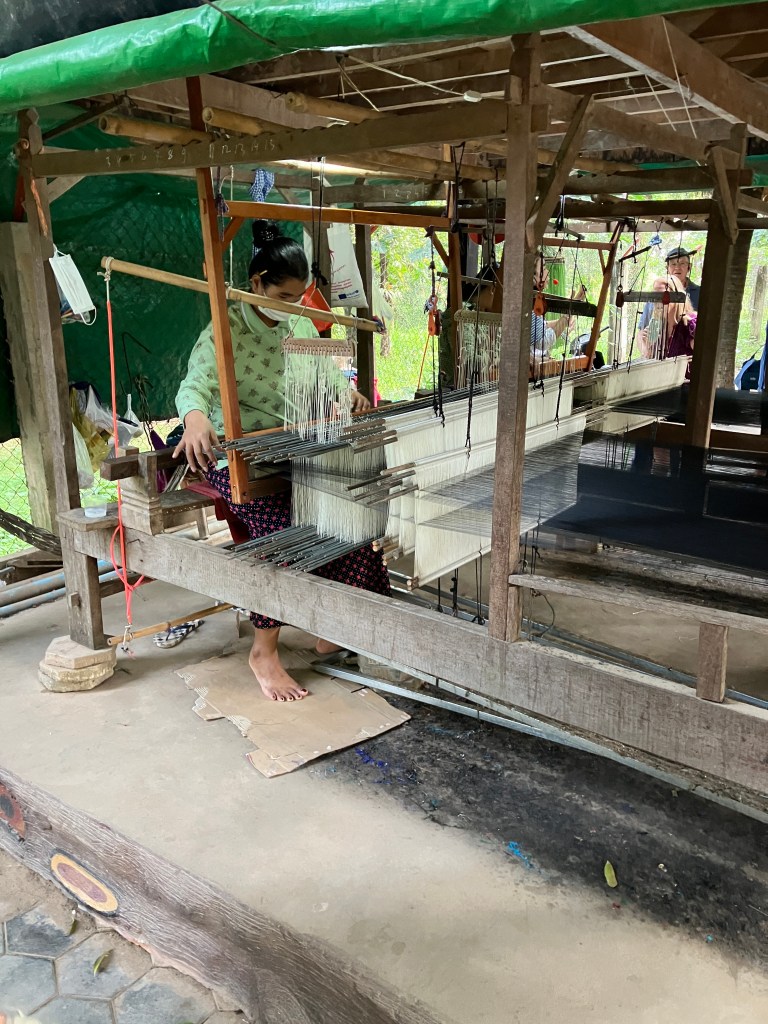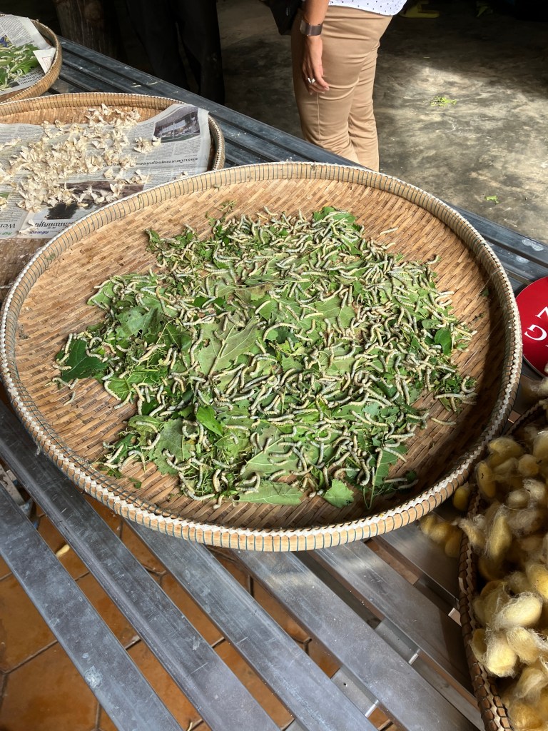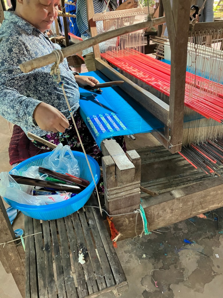 This morning our boat pulled out of Phnom Penh. We traveled about an hour upstream to an island in the middle of the river. This island, about 1 3/4 miles wide and 3 1/2 miles long, is home to 1500 families, 7,000 people and 2 public schools. It is also home to a silk workshop, where they produce silk and weave a wide variety of products from that silk.
