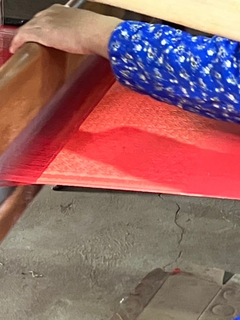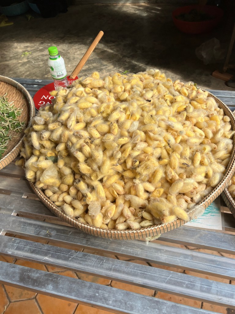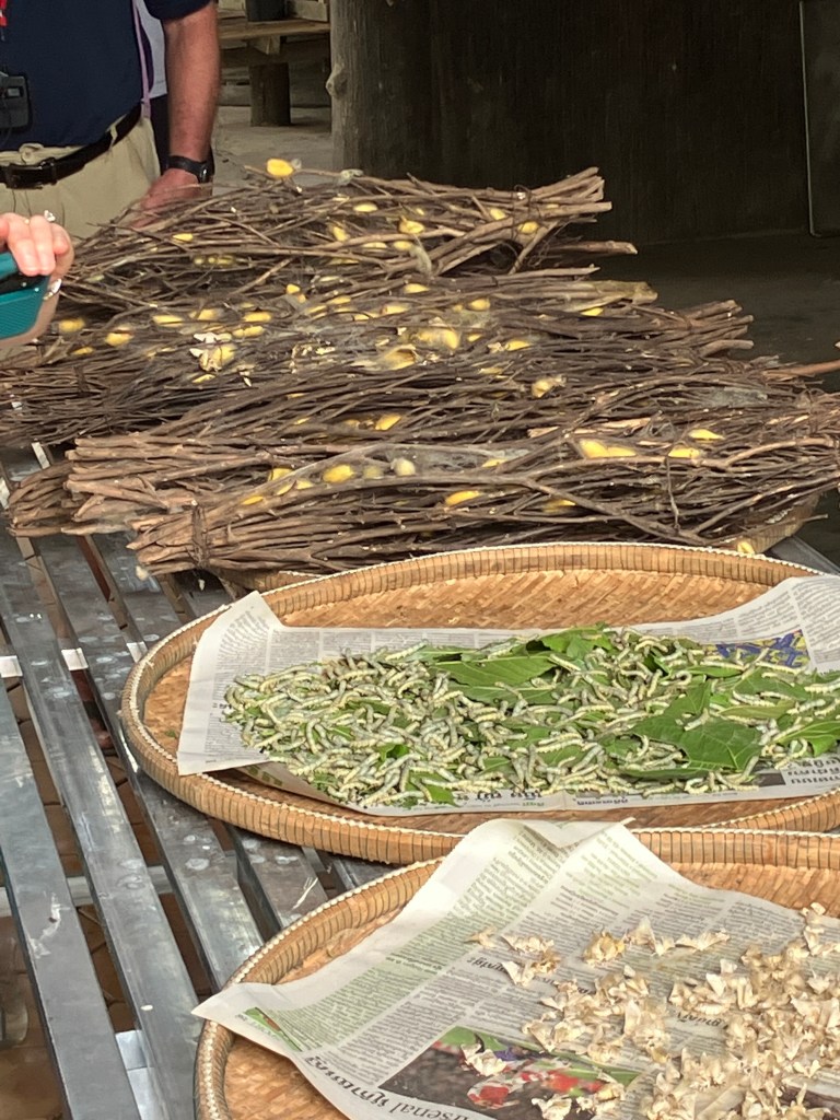 The butterflies which make silk mate for 8 hours, after which the male butterfly dies and the female lays her eggs. The eggs are collected and placed in trays where they are fed for 48 days. They then are placed into bundles of twigs to spin their cocoons for 10 days. Most of the cocoons are collected (not all so they have more butterflies to continue the process), and dried in the sun to kill the worm. Each cocoon has about 450 meters of thread. When they are ready to make the thread, between 30 and 40 cocoons are boiled, the threads from each gathered together and twisted into a single thread. The threads are dyed and then taken to the weavers. Each weaver can make about 1/2 meter in an 8 hour day, depending upon the intricacy of the pattern.