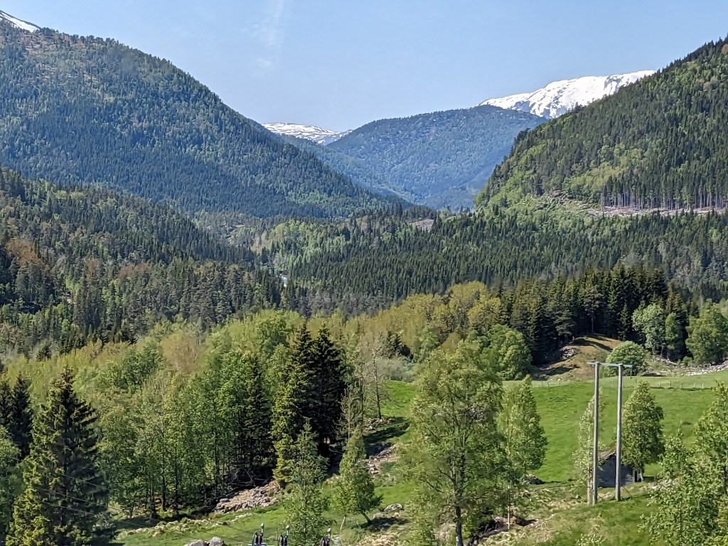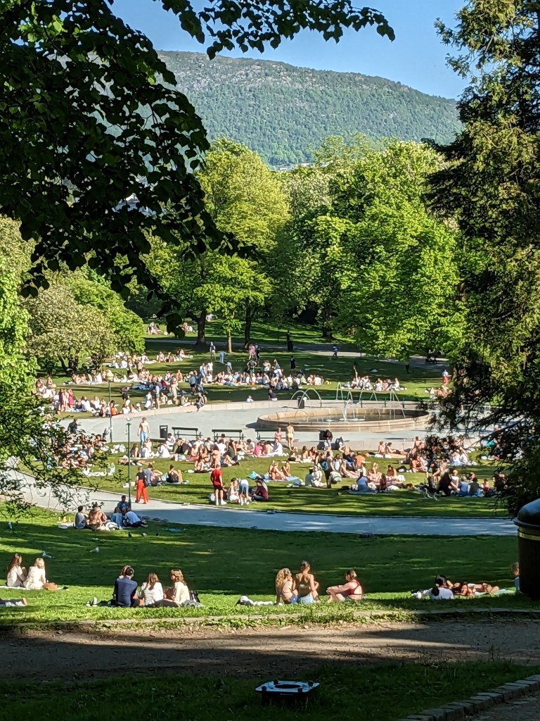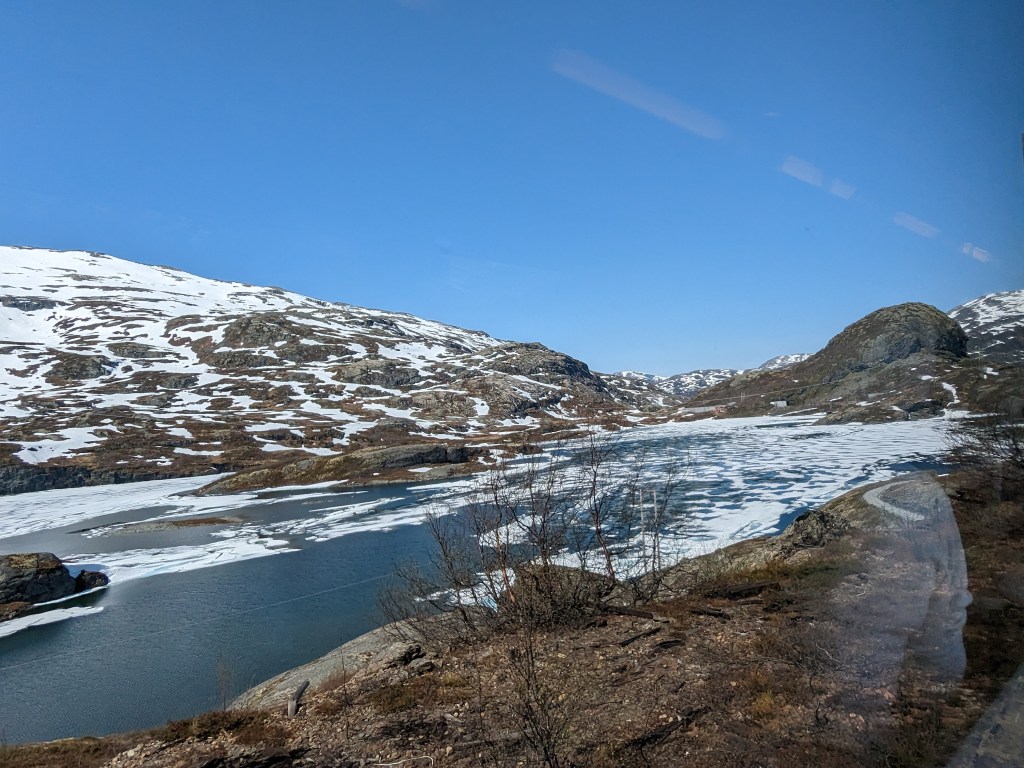 This morning we caught a train in Oslo and left for Bergen. It is about a 300 mile trip with quite a few stops along the way, so it takes 7 hours. The elevation changes from sea level up to 4,000 feet at Frinse, which is about 2/3rds of the way to Bergen. It is amazing to see the changes in scenery along the way. At the high point we saw a perpetual glacier. It is very Colorado like, but has its own greenish coloring in the snow and water. Lots of pines and birch trees. The water roars from the melting with the temperatures in the 60’s and even 70’s. Tunnels (200) are a constant, and 300 bridges. This would be a rough area to live in, most houses were painted rust red which is pretty next to the snow and green landscape. We spoke with a Norwegian couple on the train, he came from a small town in this area. He said that they make their money though the tourists and ski industry. Voss a town of about 16,000 is an hour outside of Bergen and is known for extreme sports with tourists from all over. The little city is really nestled into the mountains. The Norwegian Olympic team practices in Voss. Bergen brings us to sea level and into the second largest town in Norway at 280,000.