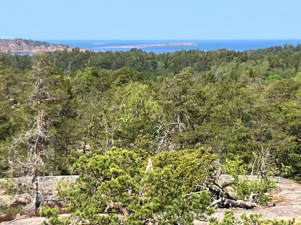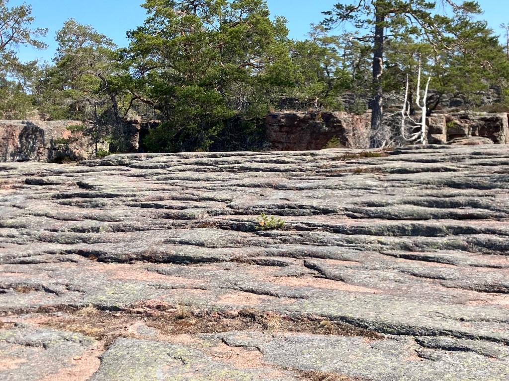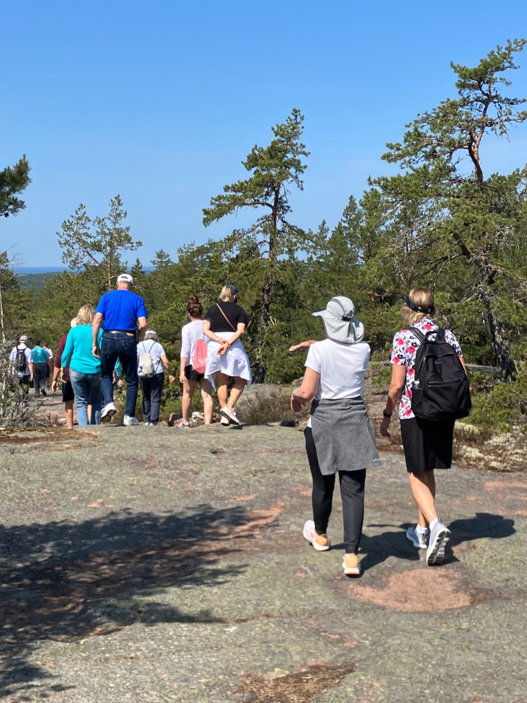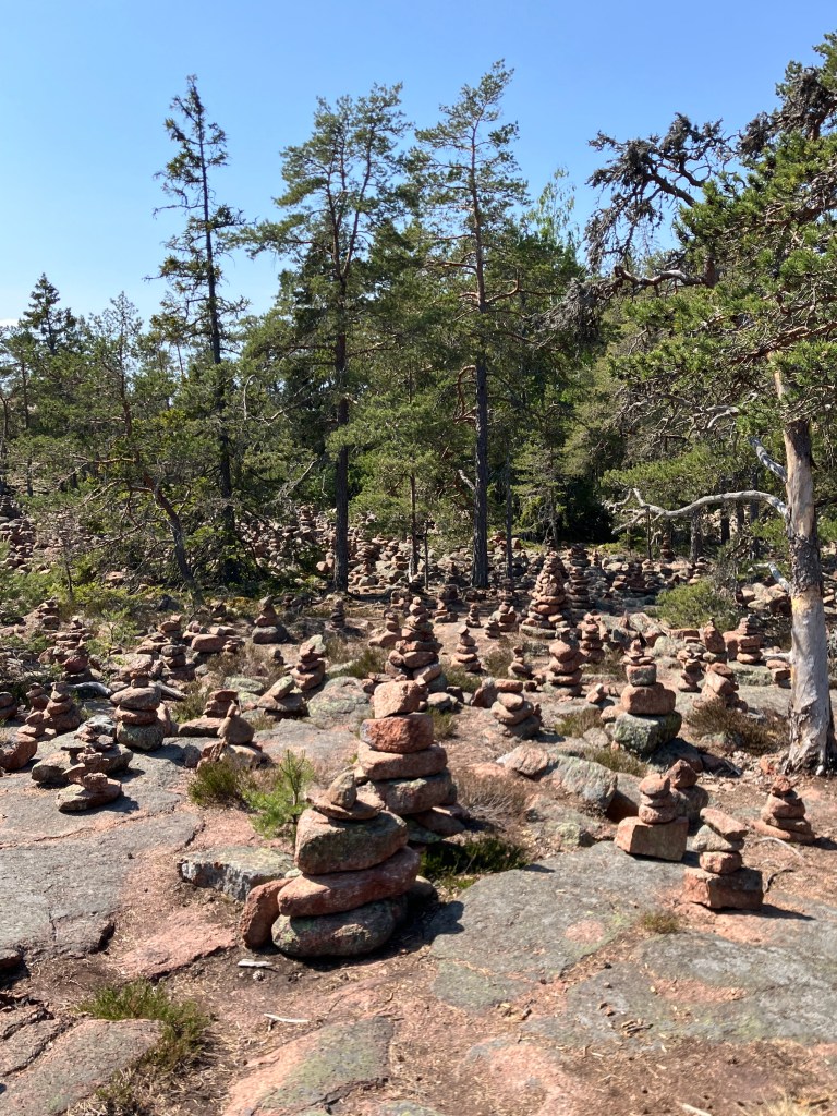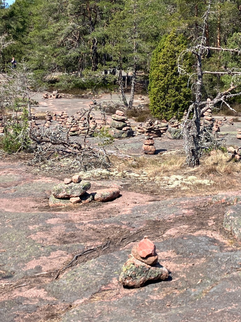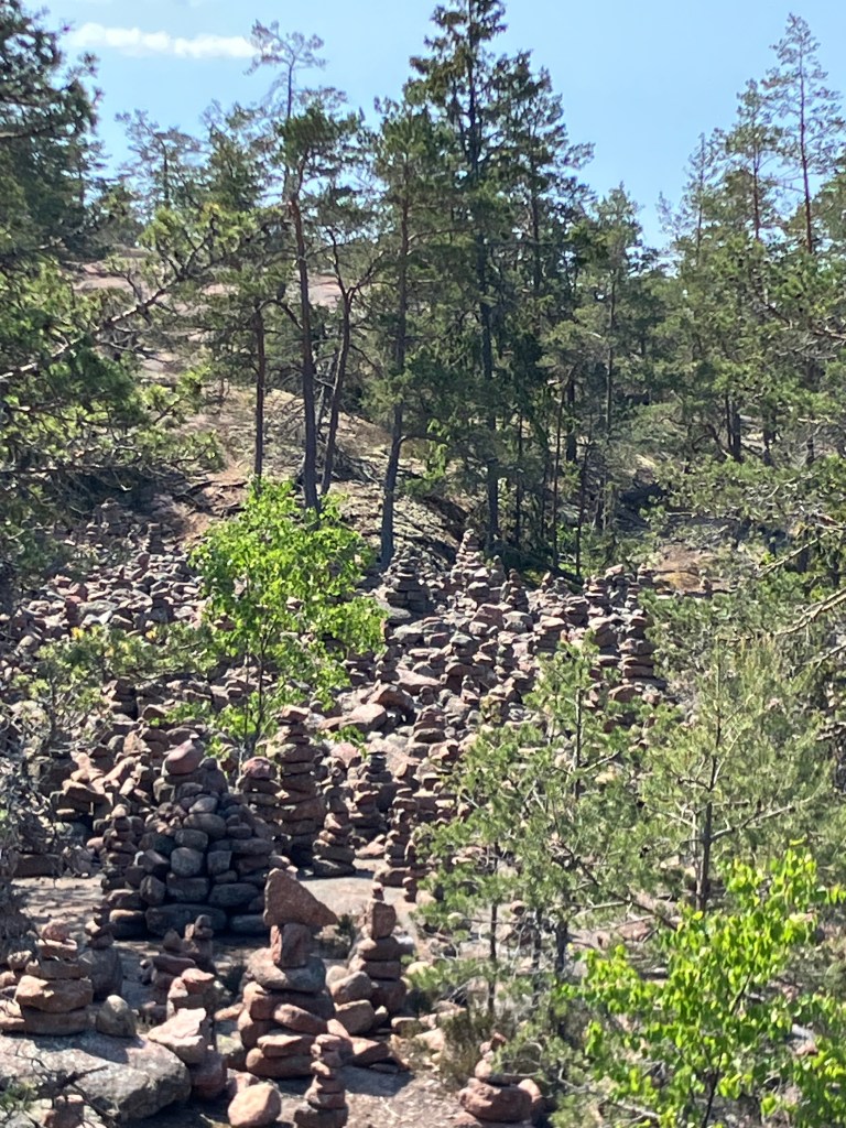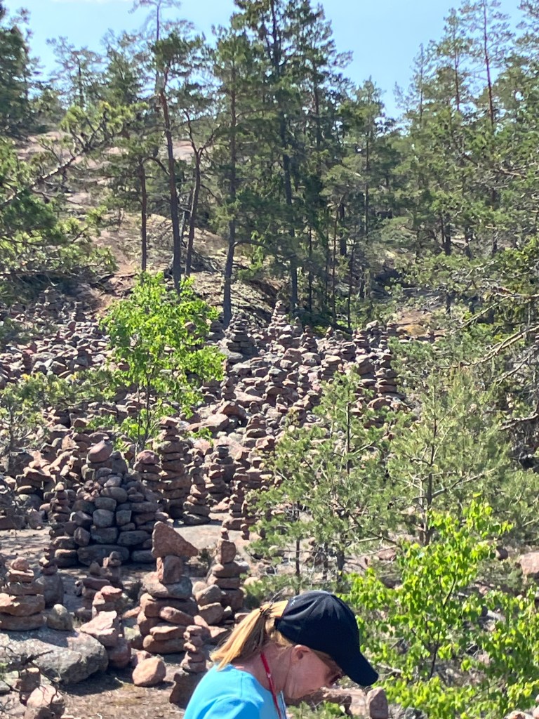 The hike we took today took us up above the tree-line onto waves of red granite. The stacked rock in the pictures below are because former visitors thought it would be a good thing to rearrange the natural terrain. The pines were sparse and it was quite rugged. The temperature was in the mid 70’s, but it felt much warmer. After the hike we had a traditional Åland (Or land) pancake. They are thick and custard like, not at all like our pancakes.