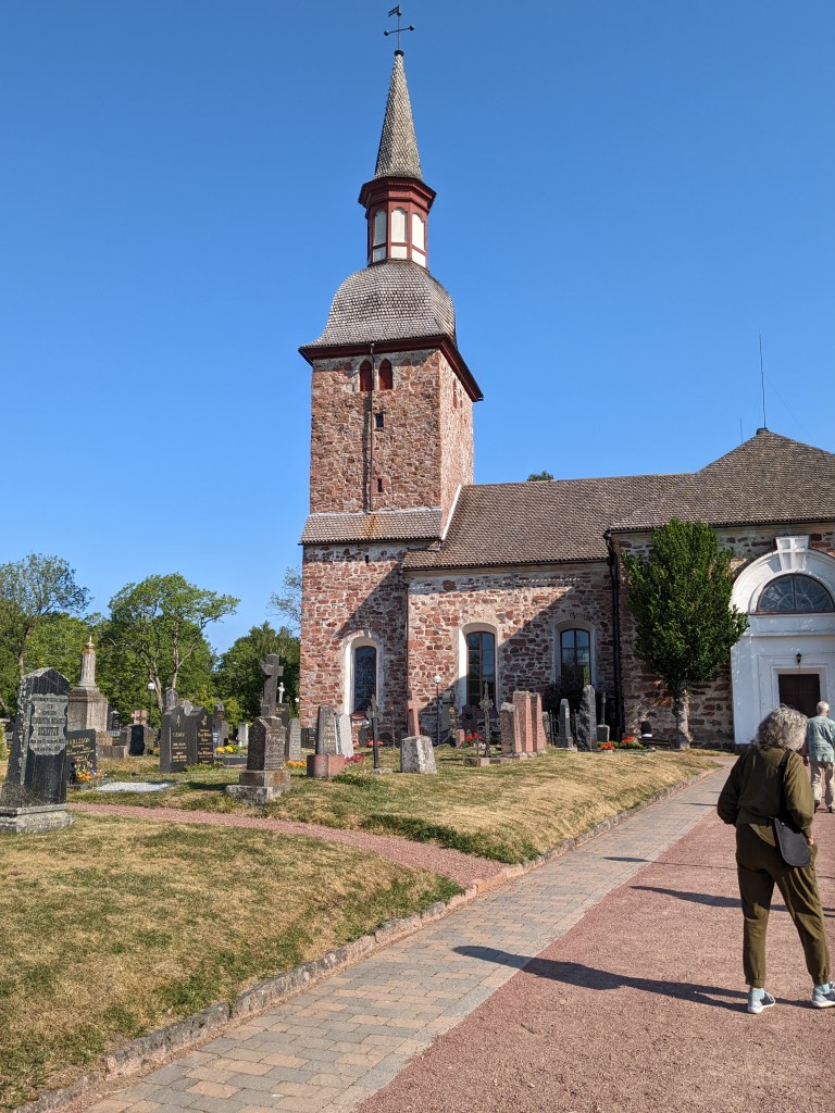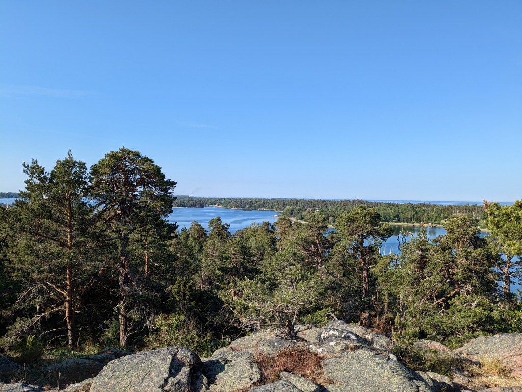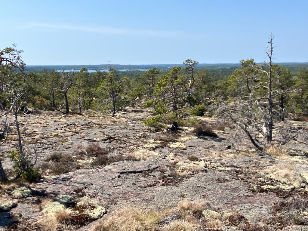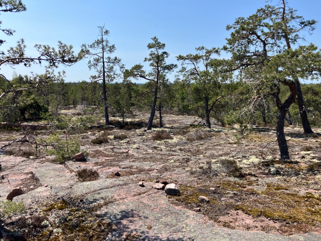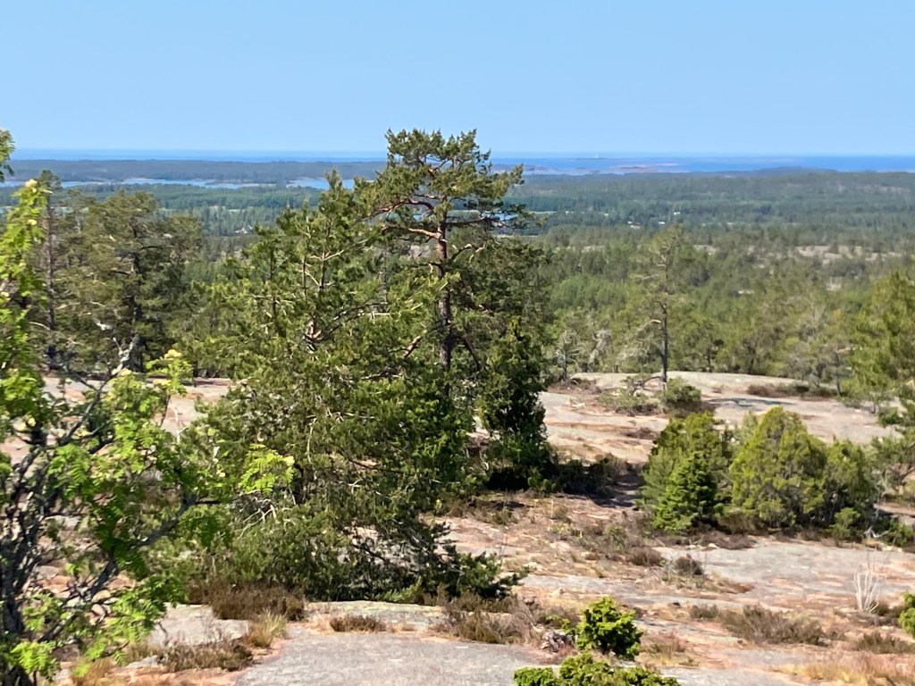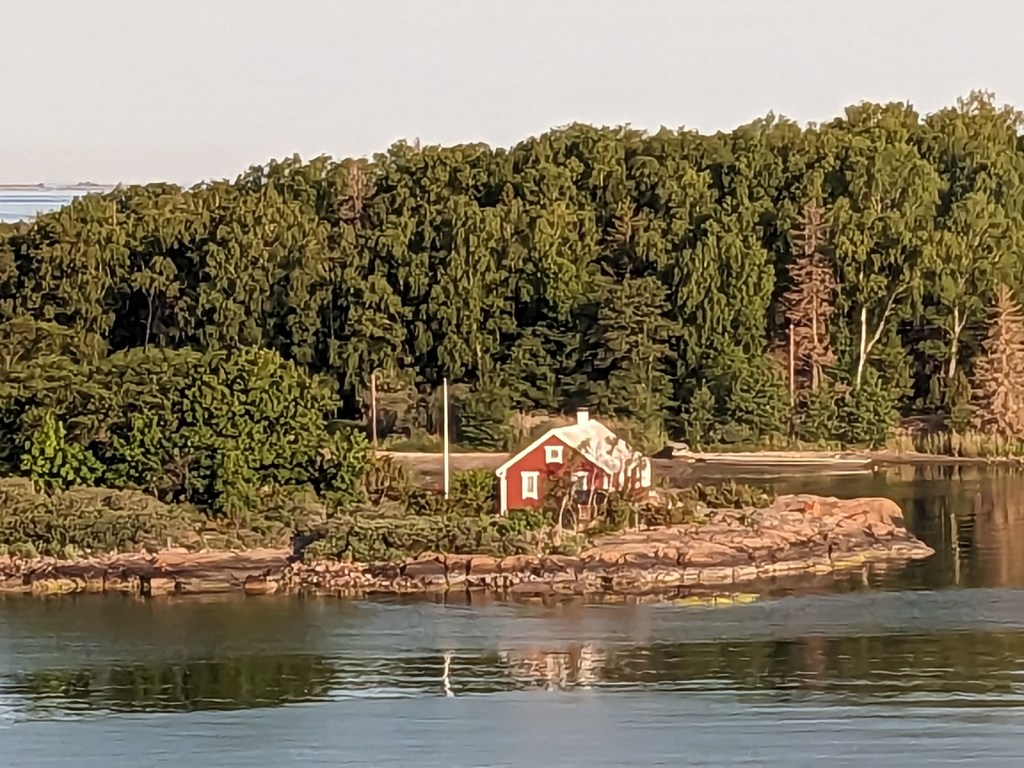 The hike we took today took us up above the tree-line onto waves of red granite. The stacked rock in the pictures below are because former visitors thought it would be a good thing to rearrange the natural terrain. The pines were sparse and it was quite rugged. The temperature was in the mid 70’s, but it felt much warmer. After the hike we had a traditional Åland (Or land) pancake. They are thick and custard like, not at all like our pancakes.