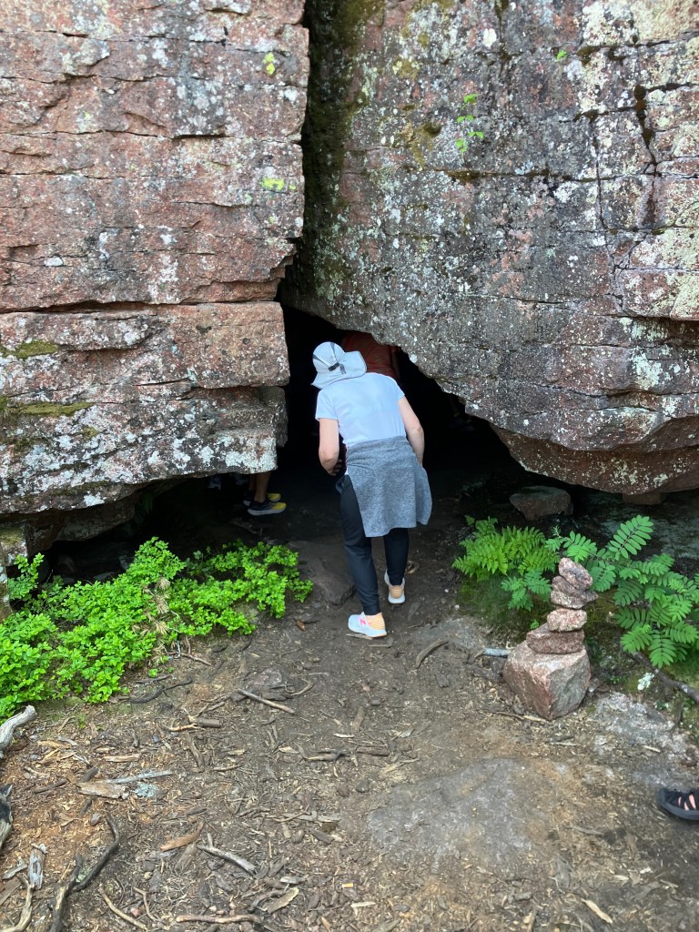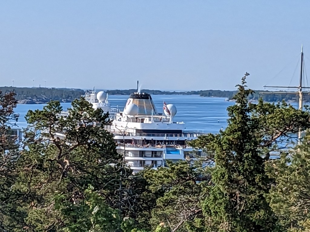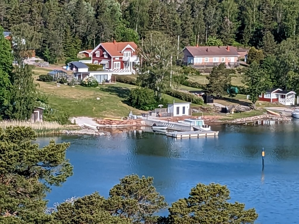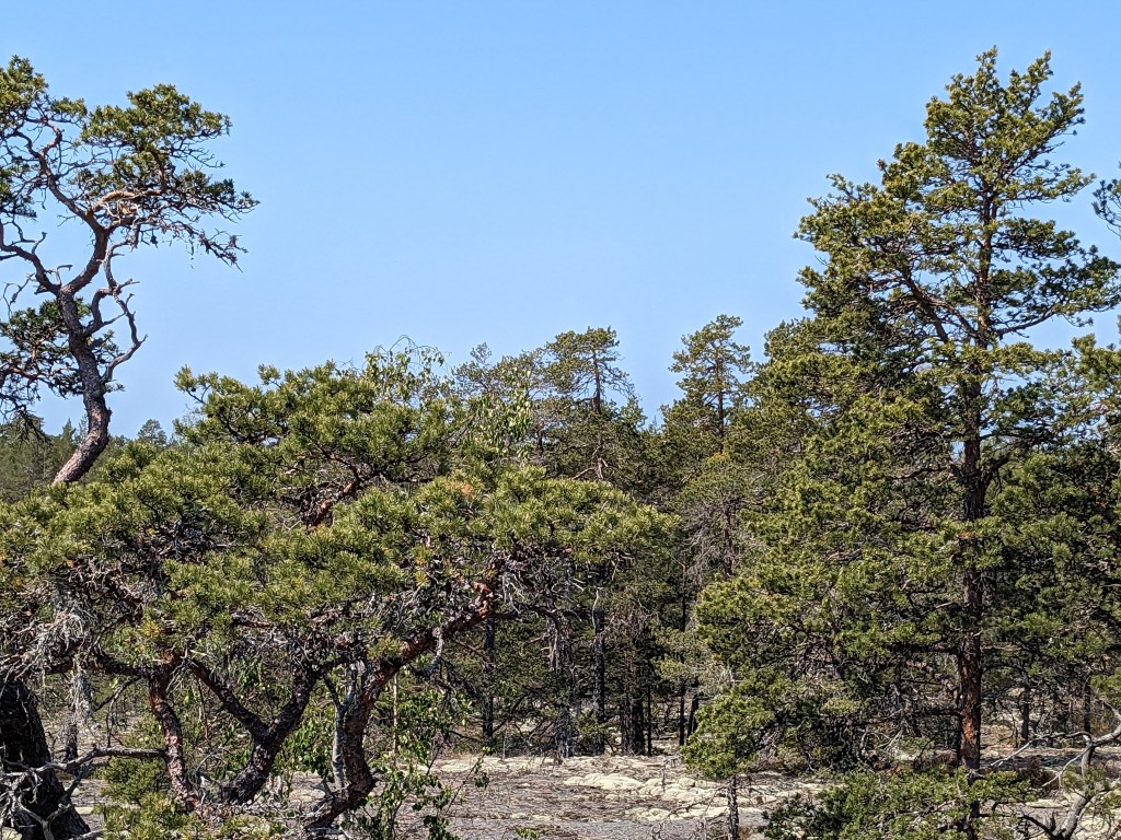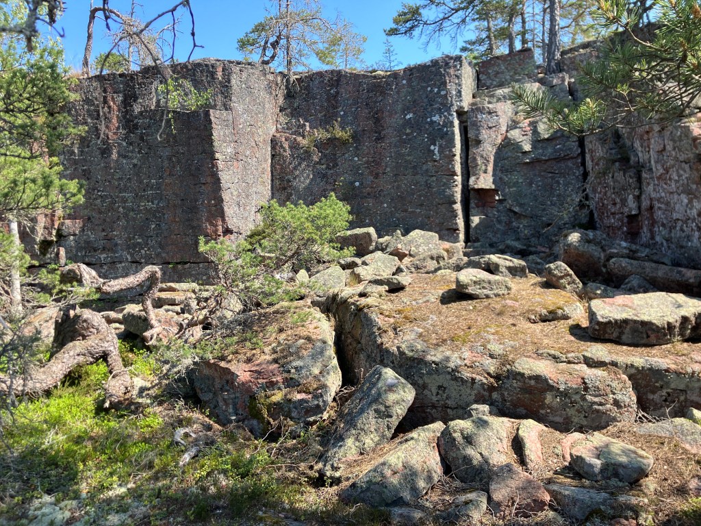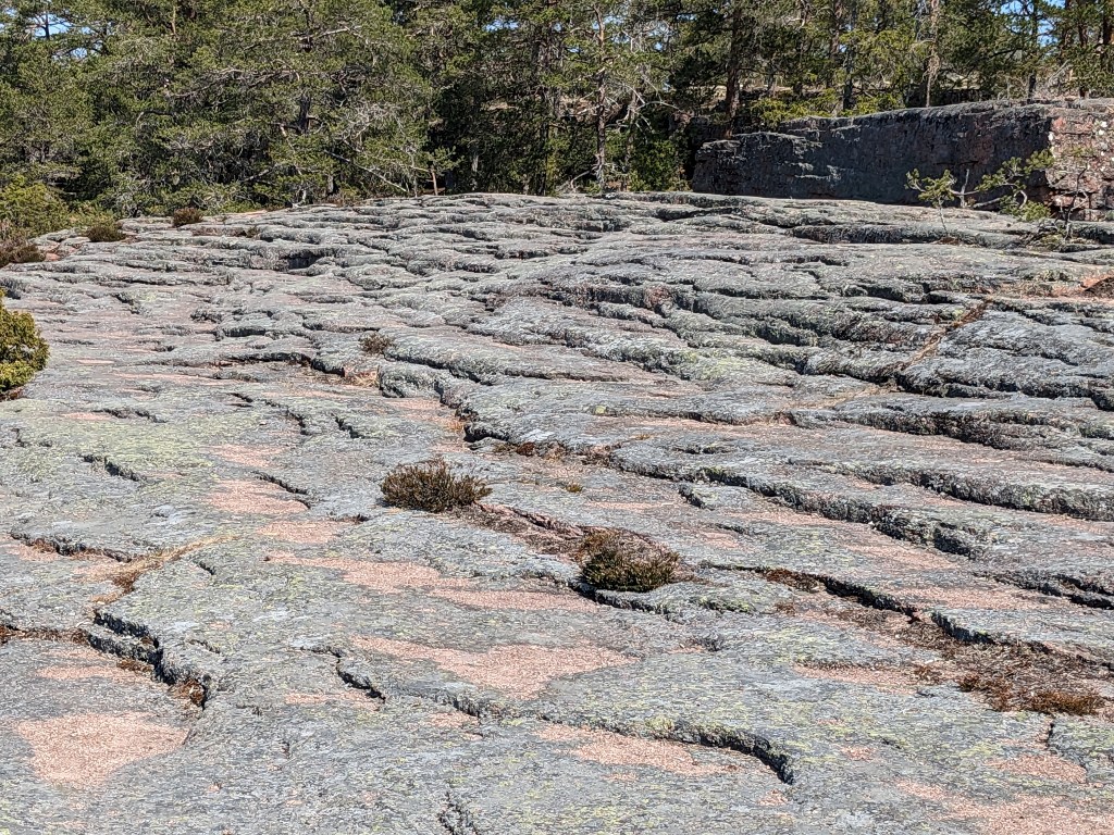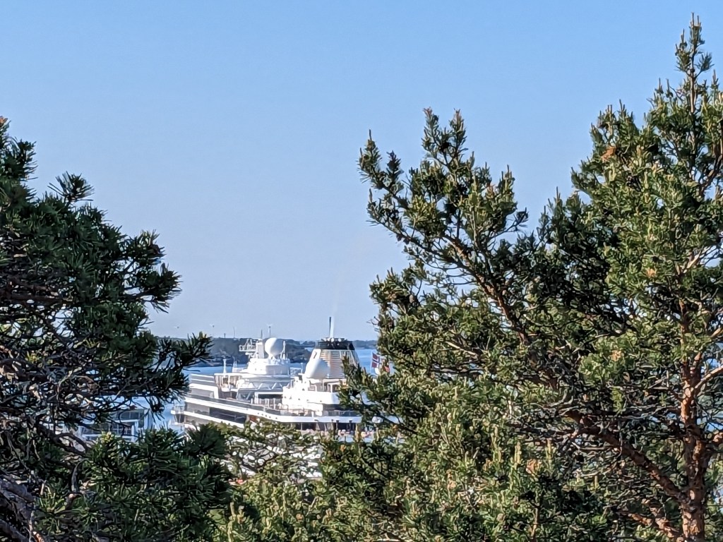 The hike we took today took us up above the tree-line onto waves of red granite. The stacked rock in the pictures below are because former visitors thought it would be a good thing to rearrange the natural terrain. The pines were sparse and it was quite rugged. The temperature was in the mid 70’s, but it felt much warmer. After the hike we had a traditional Åland (Or land) pancake. They are thick and custard like, not at all like our pancakes.