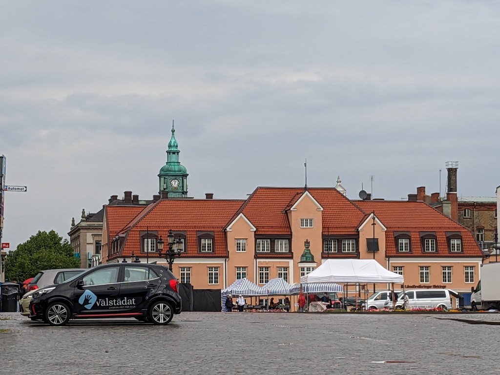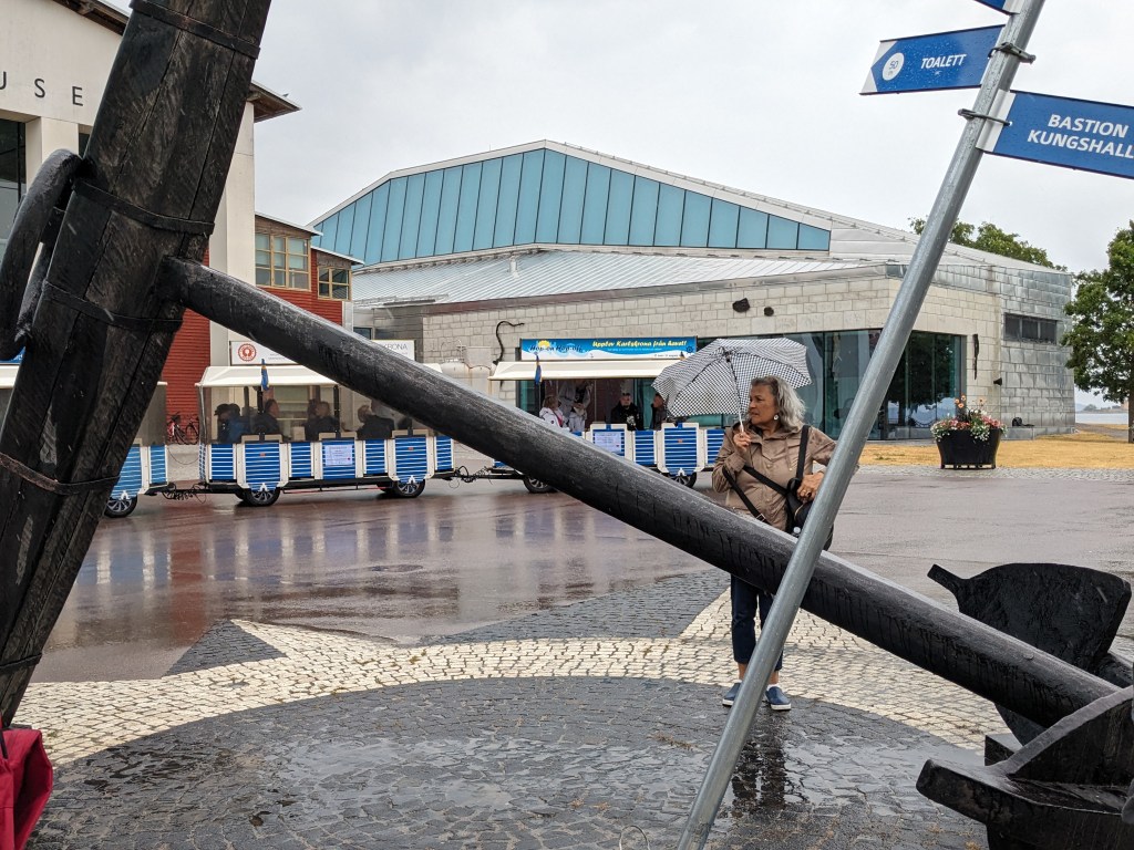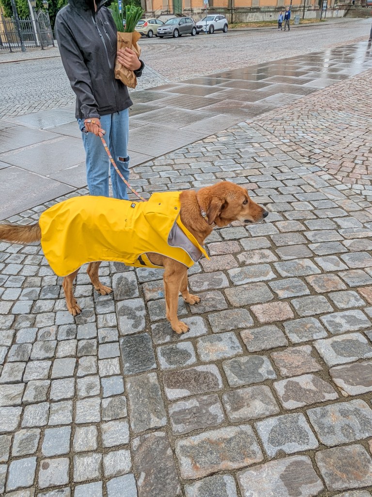 There are three churches in the old town area. There is a Catholic church, German Protestant and Fredrikskyrkan where the choir was practicing. The square is the largest in Scandinavia. We met Bailey the dog, he was prepared for the rain with his little yellow slicker.
