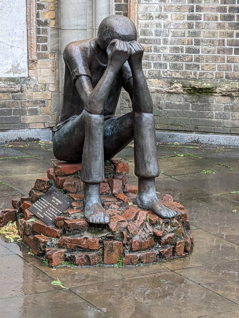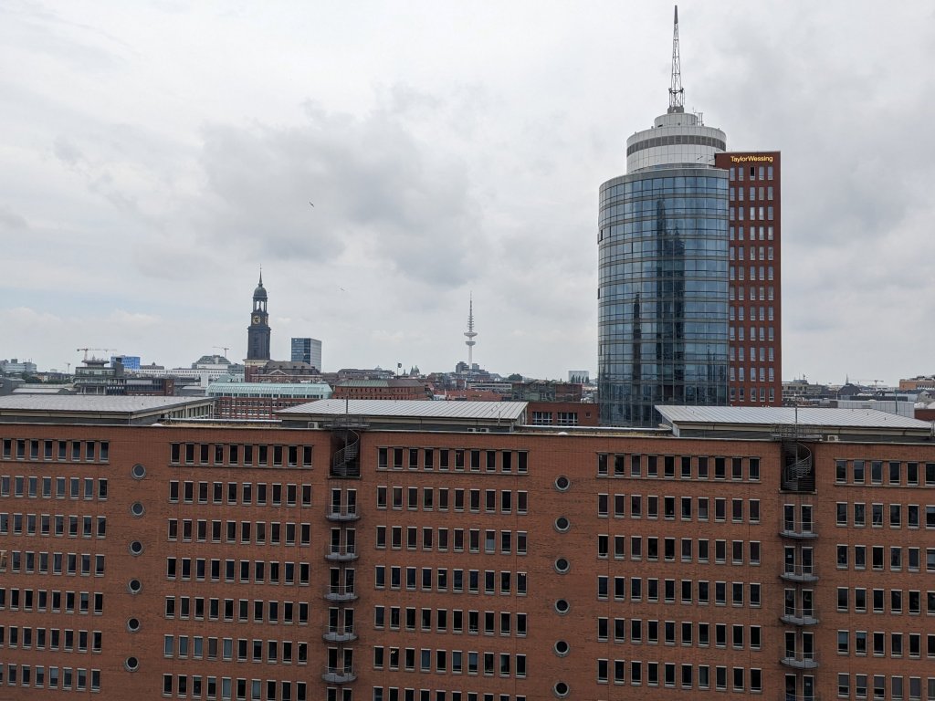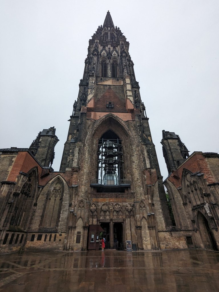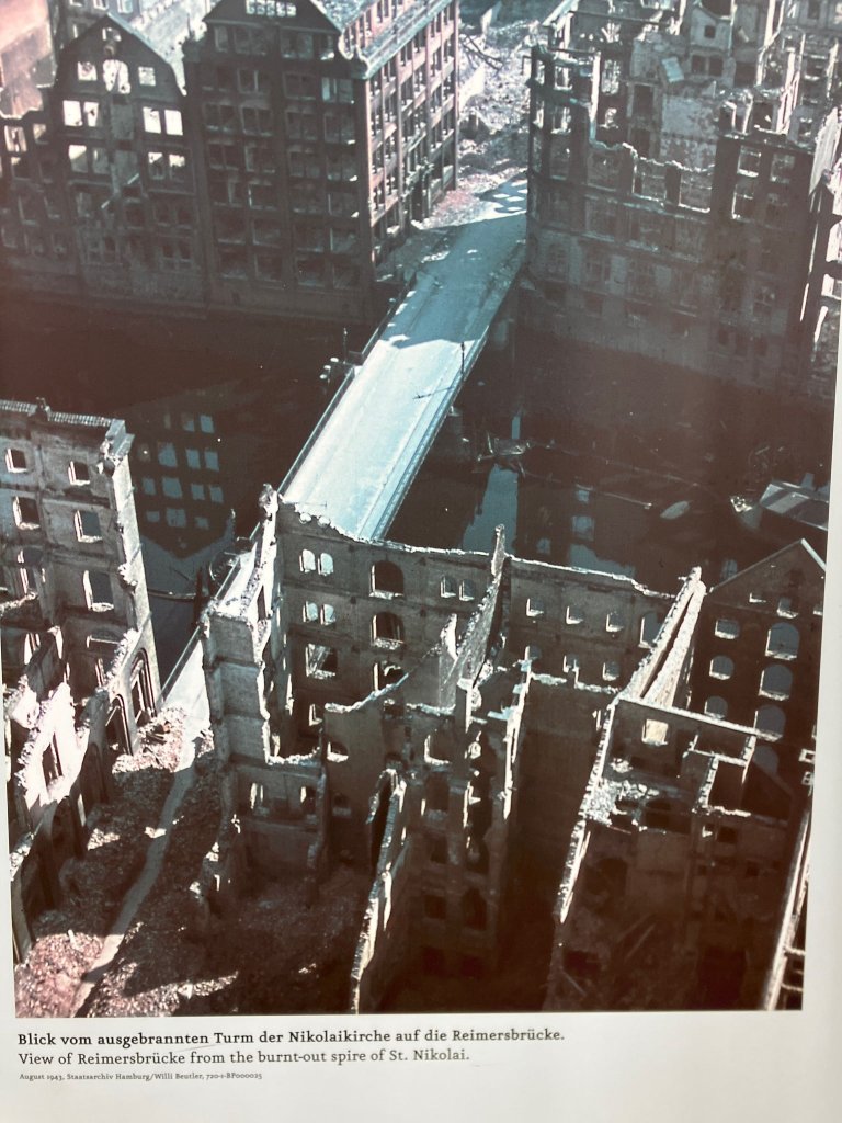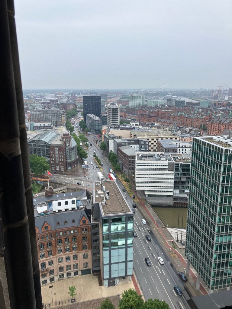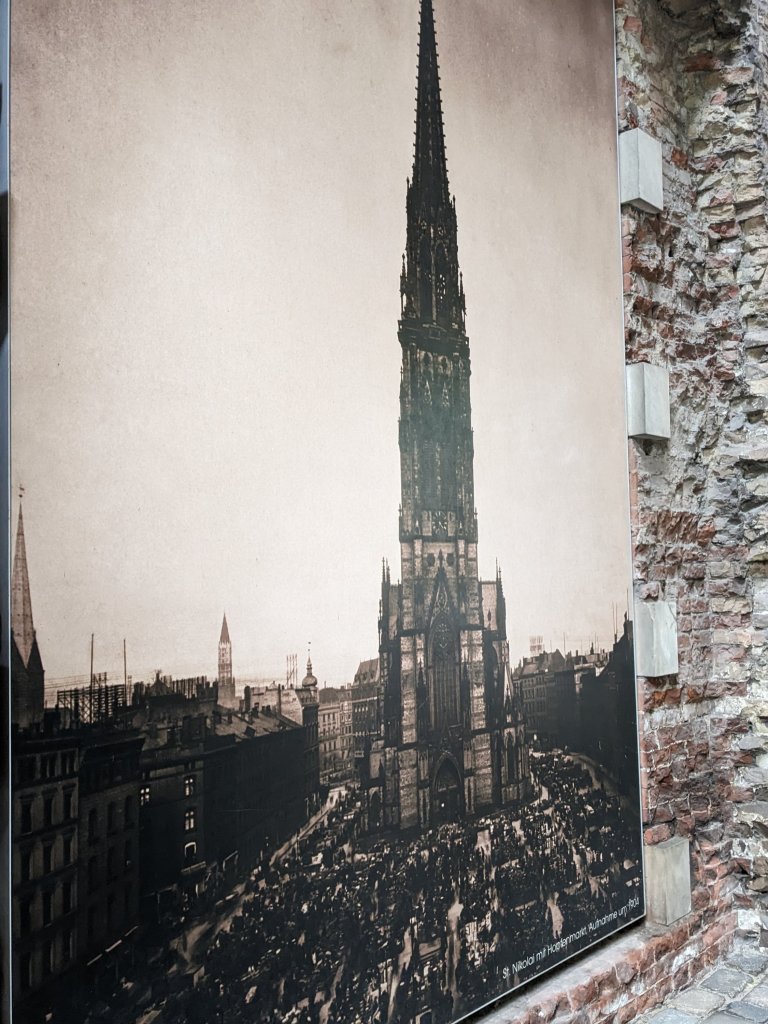 From Wunderland we walked to the St. Nikolai Church. It was the target of allied bombing in WWII. It created a firestorm which took out most of the inner city of Hamburg in July of 1943. Remarkably the spire was not destroyed like the rest of the church. There was a very comprehensive museum in the basement where the church used to stand. Bryan went up in an elevator to the top of the spire. It is the 5th tallest in Europe and was the tallest for a long time.