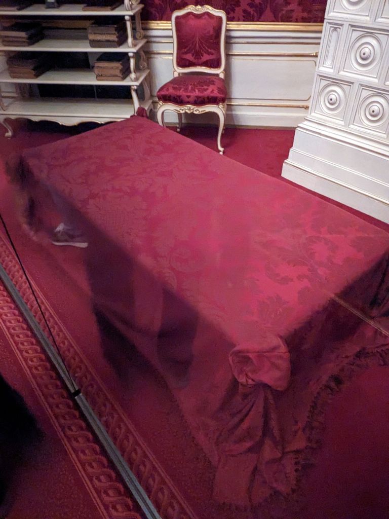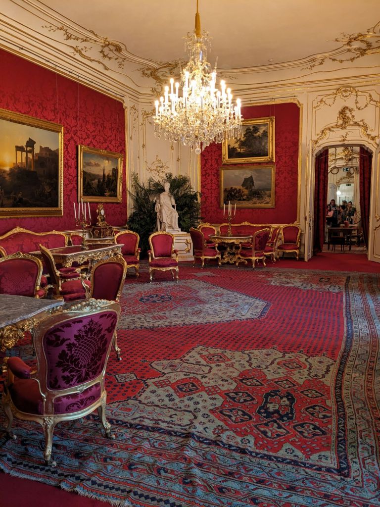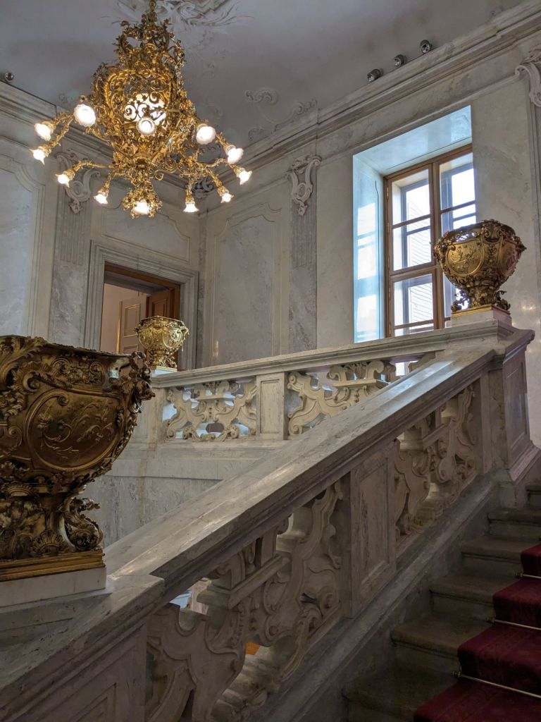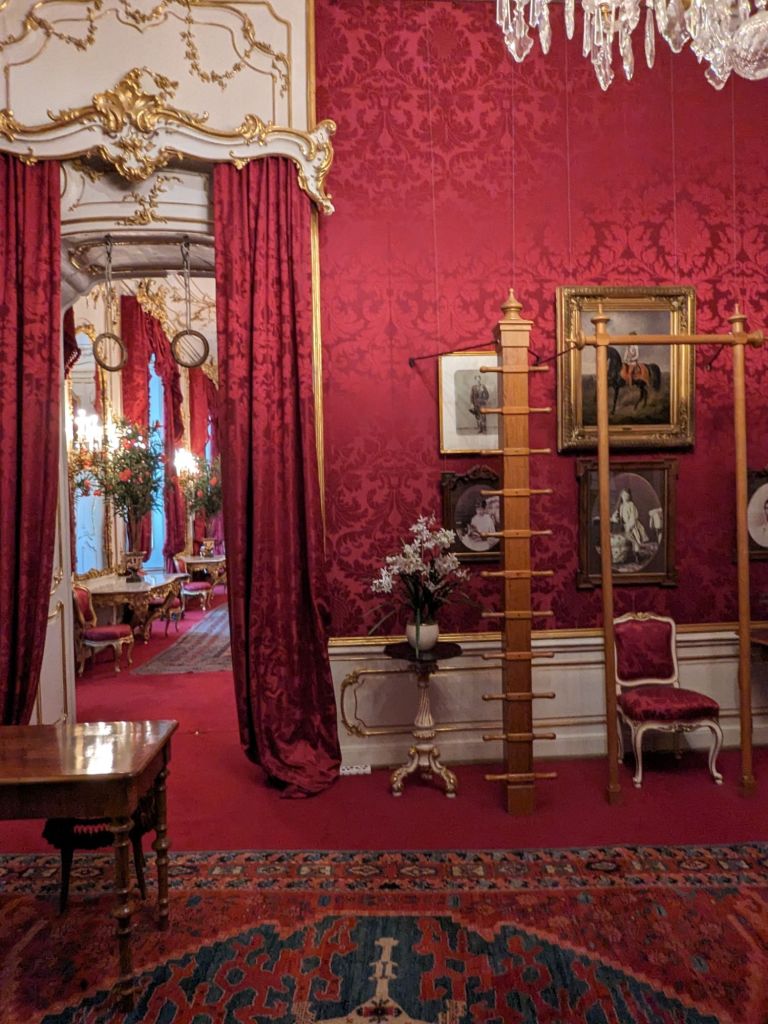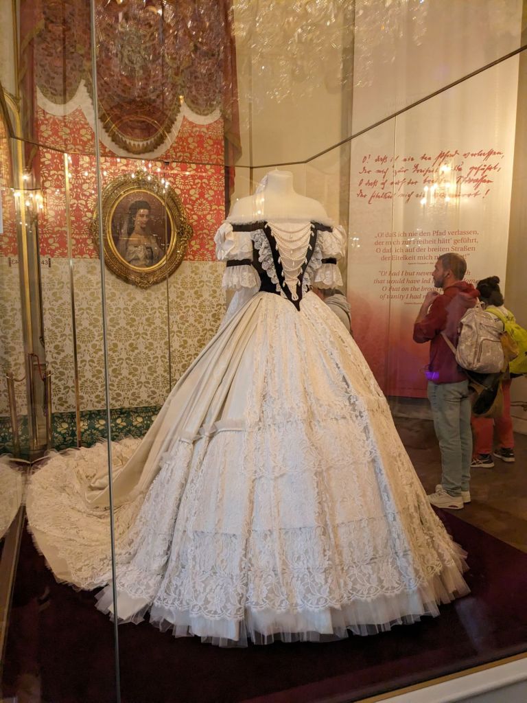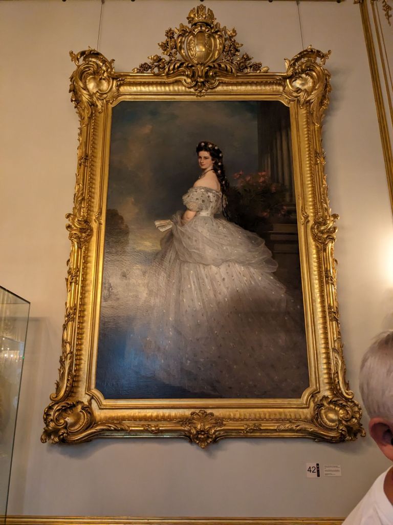 We read that Empress Elisabeth or Sisi’s apartment was a must see, so we got tickets and went this afternoon. We saw both Franz Joseph, her husband’s apartments and Sisi’s. Sisi came from Munich and was part of the Bavarian royal family. Her sister was chosen to marry Franz Joseph, part of the Austria Hungary Empire, but he fell in love with Sisi, the younger sister and they married a year later when she was just 16. Sisi did not like the attention that came with the title and struggled. She eventually dealt with it somewhat. She was ahead of her time because she exercised daily, with work out rings and bars. She liked a massage after exercising too. She cleaned her teeth regularly, feeling that that was important. Sissi was assassinated in 1898 at 60 years old.