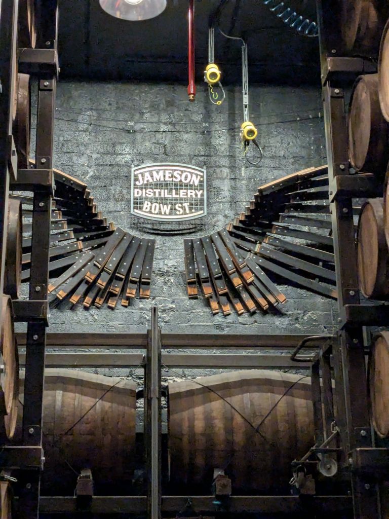 This afternoon we scheduled a tour at Jameson. John Jameson and his wife Margaret started the distillery in 1780. Like Guinness, they very much value their employees and it is a prize place to work. The distillery was located in Dublin until 1971 when it was moved to Cork. There they have millions of casks in storage, most are blended and then shipped to Dublin for bottling. While in storage the casks lose 2% of their whiskey to evaporation, they call it the angel’s share. They say this 2% is equal to 34,000 bottles a day, lost to the angel share. Irish Whiskey must be stored in Ireland for at least three years in order to be called Irish.